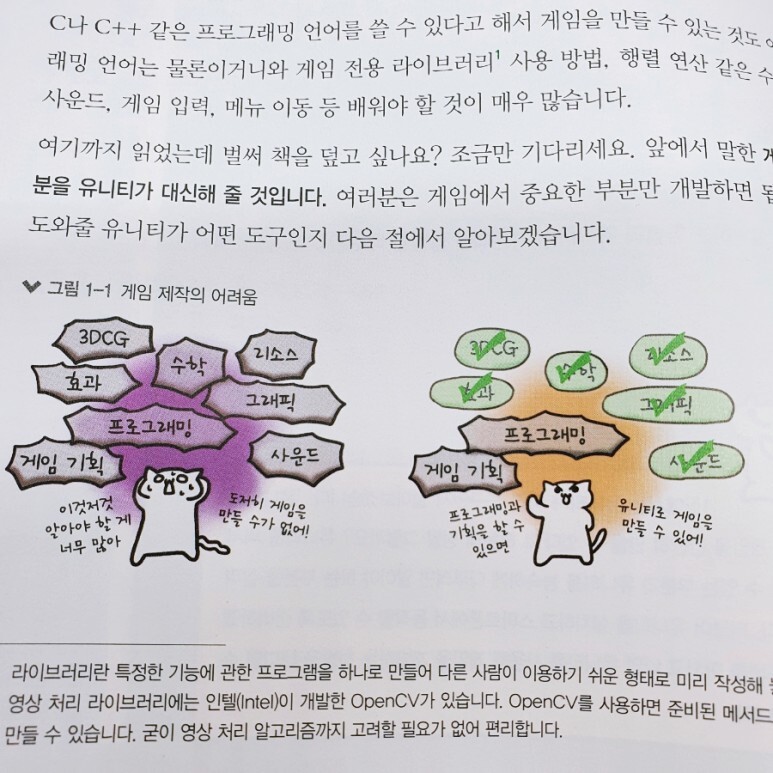 게임을 처음부터 만드는 것은 매우 어려우니, 어려운 부분은 유니티가 대신해 줄 것입니다. "여러분은 게임에서 중요한 부분만 개발하면 됩니다." 라는 말처럼, 게임 제작에 중요한 부분에 집중할 수 있도록 책이 구성되어있고 그렇게 따라갈 수 있습니다.