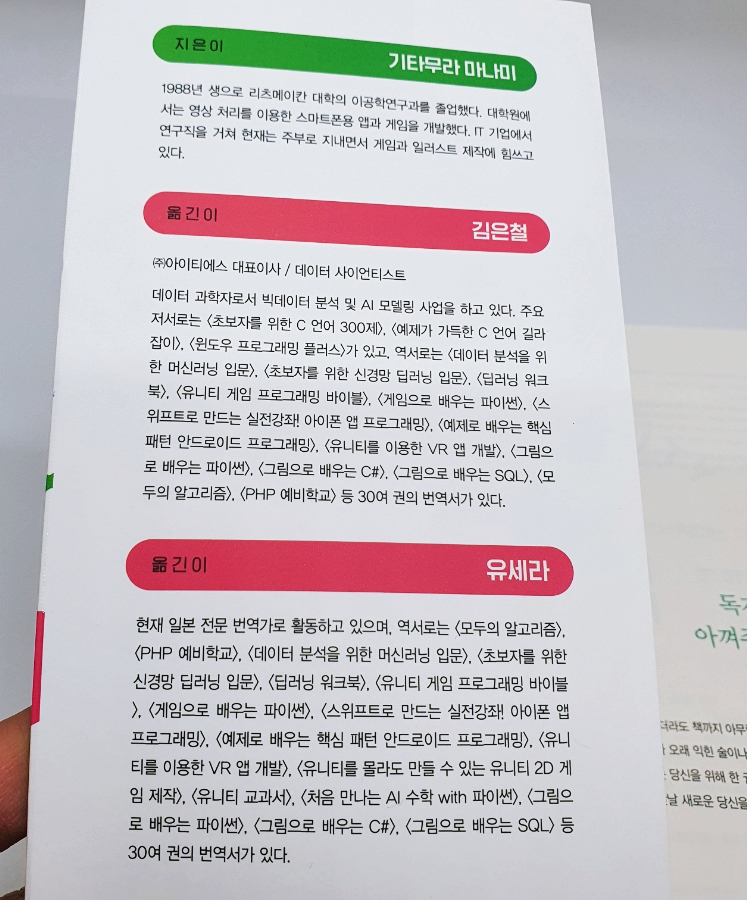 책이 워낙 훌륭해서, 이 책을 통해 기타무라 마나미님을 스승으로 둔 게임 제작자 분들도 계실거라 생각이 들 정도. 좋은 책을 훌륭하게 잘 옮겨주신 김은철님 유세라님께도 감사인사를 드립니다. 예제 소스는 길벗 출판사의 깃헙 저장소에서 다운로드 하실 수 있습니다.