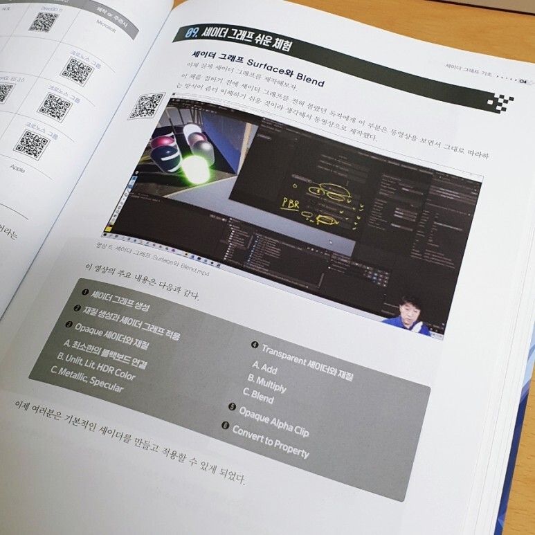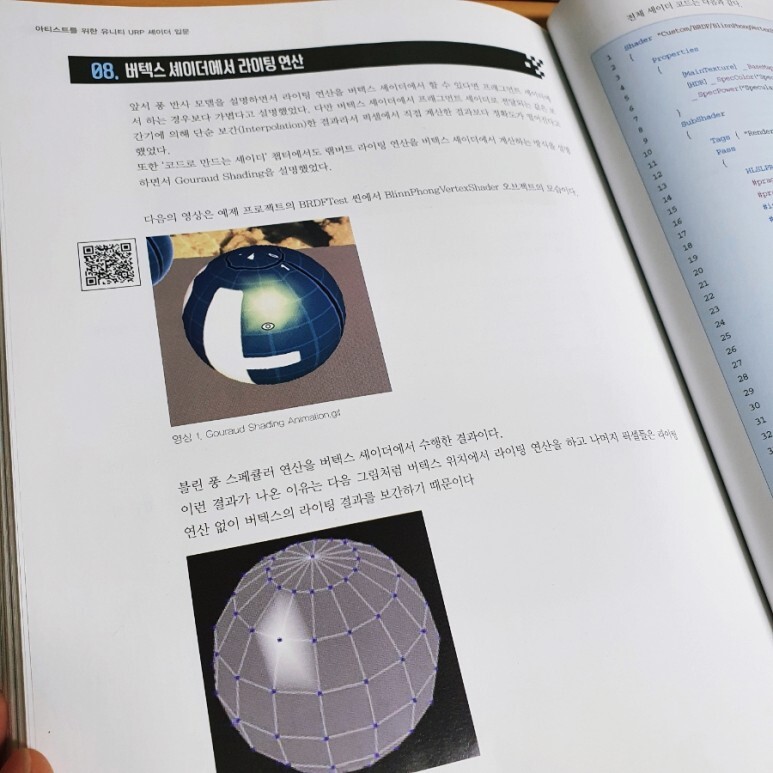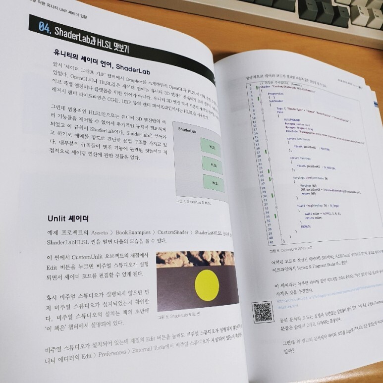 비엘북스의 신간이 모두 지원하는 편의성인지는 모르겠지만, 아티스트를 위한 유니티 URP 셰이더 입문 책에서는 이렇게 부가 설명을 위한 QR 코드를 제공합니다. 스마트폰으로 촬영하여 링크를 타고 이동하고 즉시 움짤을 보고 이해를 돕는다거나, 동영상 강좌, 참고 이미지 등을 확인할 수 있습니다. 즉시 움짤로 셰이더 결과를 확인할 수 있는 부분들은 이해를 돕는데 매우 도움이 되었습니다. 그래서 책 뒤로 갈 수록 어디 QR 코드 또 없나 찾게 될 정도.