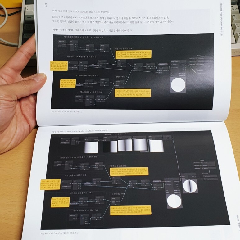 셰이더 그래프의 전체적인 모습을 보여주기 위해 가로 방향 페이지도 일부 제공하고 있습니다. 그래프를 도면 보듯이 보며 따라 만들다 보면 확실히 연습이 될 수밖에 없어보입니다. 예제 파일들도 GitHub 를 통해 제공하고 있지만, 내용이 내용인 만큼 직접 만들어보는 것 만큼 좋은 학습은 없으니까요.