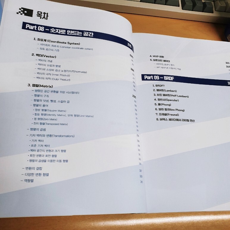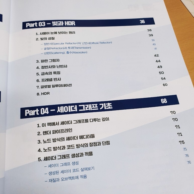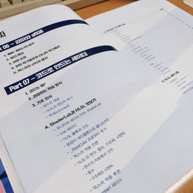 목차 구성에서 셰이더 입문을 위해 어떤 것들이 필요하고, 이 책에서 어떤 것들의 기초를 다룰 것인지 명확하게 보여주고 있습니다. 모두 셰이더 개발 입문을 위해 필요한 것들이고, 저자의 말에 다루었듯이 최소한의 것들만 다루기 위해 애쓰신 점이 느껴집니다.