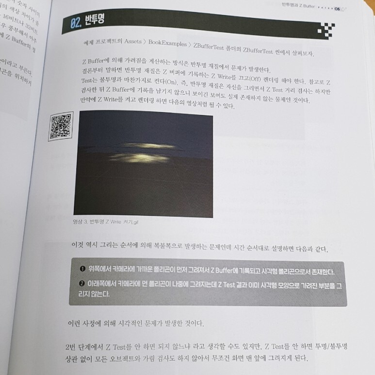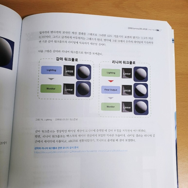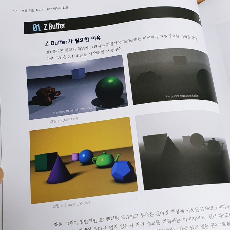 개념이 어렵거나 중요한 부분들은 따로 챕터를 할애해서 분명하게 짚고 넘어가고 있습니다. Z Buffer, 반투명 처리, 감마 보정과 감마 워크플로우, 리니어 워크플로우 등이 그렇습니다. 챕터를 따로 분리해서 다룰 정도로 명확하게 설명하면서 중요한 개념이라는 것을 강조하는 책 구성에 또 한 번 감동.