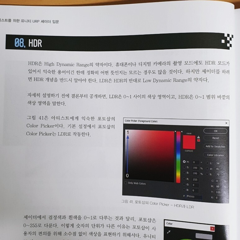 빛과 HDR 챕터에서는 빛에 대한 기본 개념과 성질에 대해 30페이지 정도를 할애하여 상세히 설명하고 있습니다. 빛에 대한 내용은 셰이더를 다루지 않더라도 그래픽스 분야에서는 필수 지식에 들어갈 정도로 중요한데, 이 부분 역시 셰이더에 필요한 최소한의 하지만 중요한 부분만 잘 정리해둔 것 같습니다.