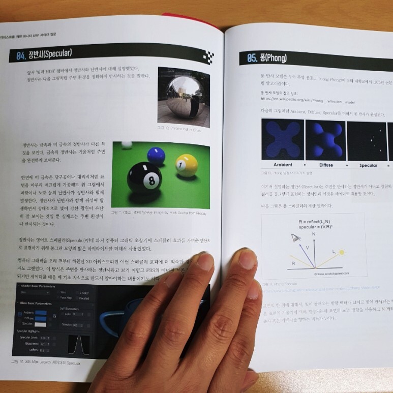 셰이더는 빛과 그림자를 다루는 기술이기 때문에 빛과 그 빛을 제어하기 위한 기반 지식들이 필수적입니다. 그래서 이 셰이더 입문 책에서도 "셰이더" 자체 실습 내용만큼 기반 개념과 수학에 관련된 내용을 큰 비중으로 다루고 있습니다만, 최소한의 것들만 최대한 쉽게 설명하기 위해 노력한 부분들이 책 곳곳에서 느껴집니다.