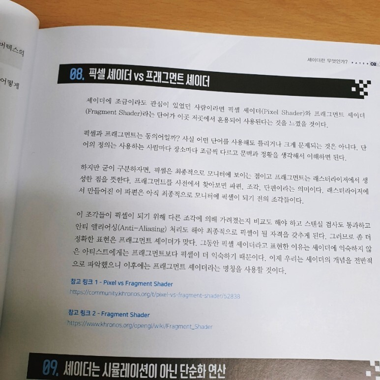 위에서 정리한 큰 틀의 순서에 맞게 살펴보면, 먼저 이 책으로 셰이더 입문을 위한 기본적인 유니티 지식들과 렌더링 파이프라인, 셰이더에 대한 기본 개념들을 다룹니다. 처음 셰이더를 공부하게 되면 수많은 낯선 용어들 때문에 혼란스러울 수 있는데, 그런 부분들을 모두 겪어오신 경험치 덕분인지 시원하게 긁어주는 구성입니다. 특히, 픽셀 셰이더(Pixel Shader)와 프래그먼트 셰이더(Fragment Shader) 용어에 대한 부분은 확실히 짚어주는 부분이 맘에 들었습니다.