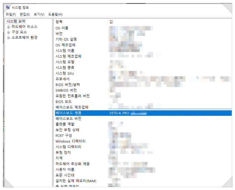 시스템 정보 창의 "베이스보드 제품" 우측에 쓰여있는 코드명이 제품명입니다. 제 메인보드는 X570-A PRO