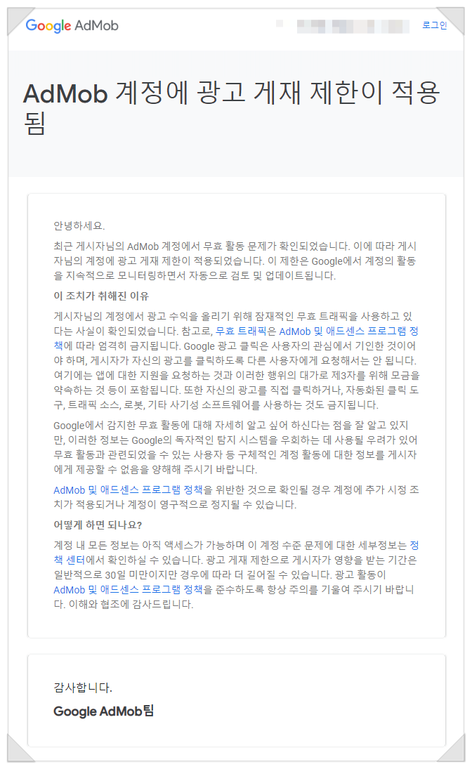 무효 활동(무효 트래픽)이 감지되었고, 광고 게재 제한이라는 제재를 가한다는 내용입니다. 무효 활동? 무효 트래픽? 구글 AdMob 을 연동하여 여러 서비스를 개발/런칭 해봤지만, 그동안 한 번도 접해보지 못했던 상황과 어휘들이라 좀 당황스러웠습니다.