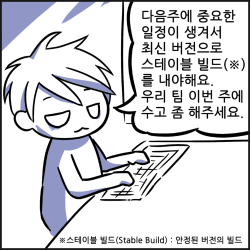 스테이블 빌드(Stable Build)는 단어 뜻 그대로 안정된 버전의 빌드를 의미하는데, 버그 없이 동작하는, 보통 시연용으로 사용할 빌드를 이야기 하죠. 이런 급한 일정이 생기면 정말 발등에 불 떨어진 것 마냥 하던 작업들을 봉합하고 빌드를 만들어야 해서 갑자기 바빠지기 마련. 이렇게 야근이 발생하기도 합니다.