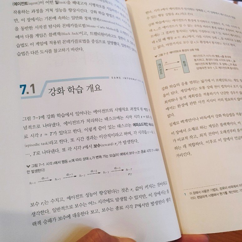 1/3 분량을 게임 정보학 알고리즘으로 소개하고 있는데, 다양한 게임들에서 다루고있는 게임 인공지능 알고리즘에 대한 소개와 개념들, 원리들을 설명하고 있습니다. 여러가지 탐색 알고리즘은 물론이고 강화 학습에 대한 내용도 다루고 있는데, 어려운 내용들을 굳이 이해하고 넘어가려 하지 않아도, 어떤 흐름이 있었는지만 이해해도 충분합니다.