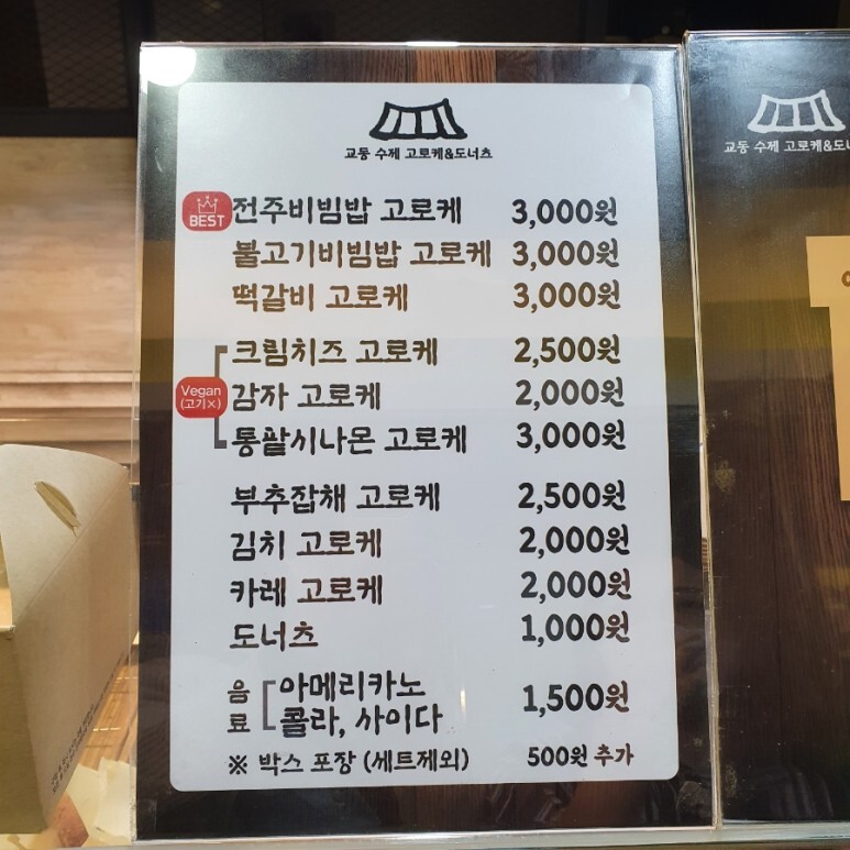 2층에는 족욕천국... 아래층에 교동 고로케 집이 있습니다. 다양한 고로케 소를 넣어서 판매하고 있고 아메리카노도 판매하고 있는데, 아메리카노는 아이스로 드시는 건 비추. 얼음이 너무 많아서 양이 별로 없어요. 그냥 고로케만 사드시는 걸 권합니다.