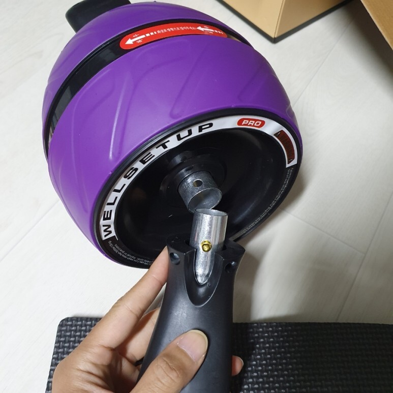 요런 구성입니다. 스펀지 깔판은 무릎을 대는 작은 매트 개념이고요, AB슬라이드 휠과 손잡이. 손잡이를 양옆에 끼워주면 끝. 손잡이는 조립/분해가 쉬워서 들고 이동하기도 좋아보입니다.