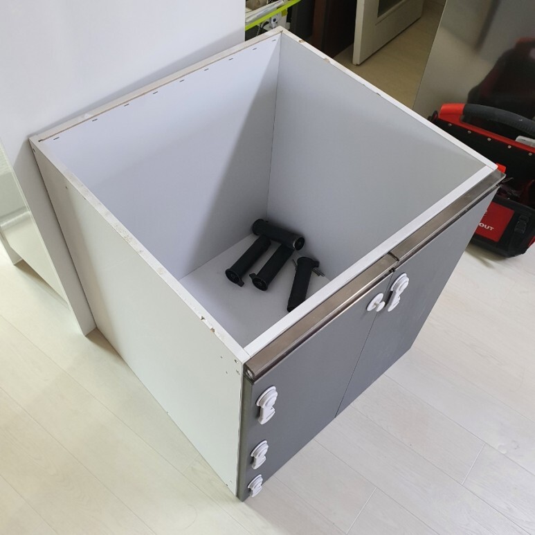 아래는 뽑아낸 하부장과, 열일한 설치기사님의 공구박스.