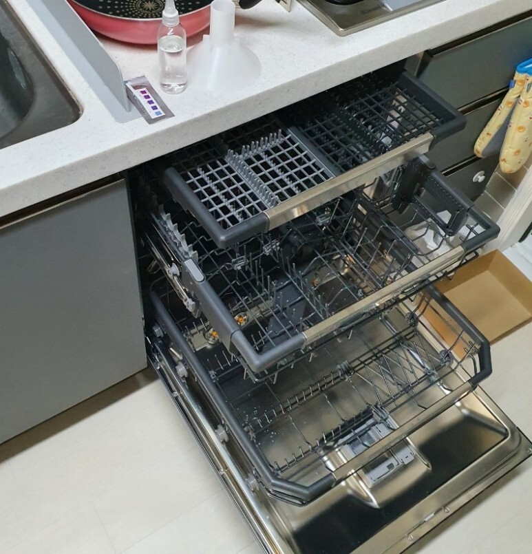 이렇게 모든 설치가 끝났습니다. 식세기 이모님 어서오세요. 연수장치에 소금 넣는 방법도 설명 해주시고, 기본적인 사용법들까지 모두 친절하게 설명 해주셨습니다. 아직 식기세척기 전용 세제는 없기 때문에 간단한 세척과 건조 기능만 테스트로 돌려봐주시고 명함 받고 깔끔하게 설치 끝. 기사님이 정말 고생 많이 해주셨어요. 감사합니다.