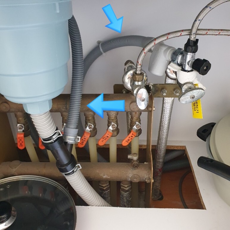 설치가 끝나면 아래와 같은 모습으로 식기세척기 급수관, 배수관이 연결됩니다. 메인 급수 벨브에서 식기세척기의 급수관이 연결된 위쪽 화살표 모습. 배수관 중간을 자르고 연결 브맂지 파츠로 배수관이 추가로 시공된 아래쪽 화살표 모습을 확인하실 수 있습니다.