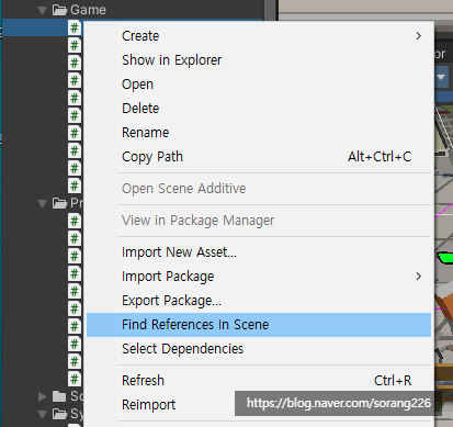 유니티 엔진으로 게임을 만들 때 종종 사용하는 메뉴 기능으로 Find References In Scene 이 있습니다. 특정 에셋을 우클릭하거나 Assets 메뉴 하위에서 이 메뉴를 찾아 클릭하면, 현재 씬에서 참조를 모두 찾아서 Hierarchy 에 보여주는 기능입니다.
