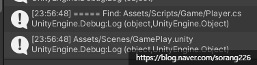 이렇게 결과를 뱉어줍니다. GamePlay.unity 씬에서만 참조되고 있군요. 이렇게 특정 에셋이 어떤 에셋들에서 참조되고있는지 한 번에 찾을 수 있게 되었습니다. 단, 모든 에셋을 순회하기 때문에 에셋 개수가 많아질 수록 처리 속도는 느려질 수 있다는 점은 유의해야겠습니다.
