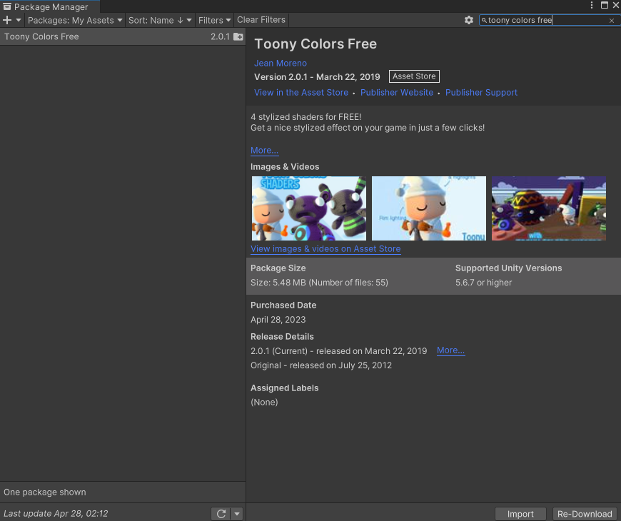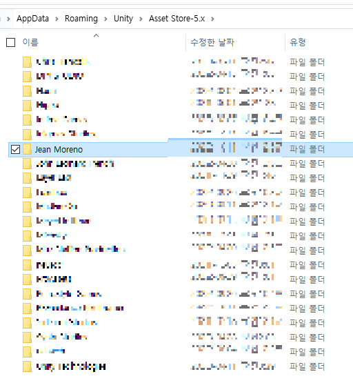 위 폴더 내에 여러 이름을 가진 폴더들이 있을텐데, 이 폴더 이름들은 모두 에셋스토어의 판매자 이름들입니다. 가령 아래의 Toony Colors Free 에셋의 경우, 패키지 파일(.package)은 Jean Moreno 폴더 하위에 위치하게 됩니다.