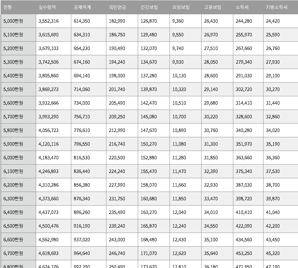 | 연봉 | 실수령액 | 공제액계 | 국민연금 | 건강보험 | 요양보험 | 고용보험 | 소득세 | 지방소득세 |