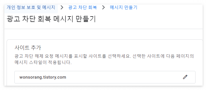 광고 차단 회복 메시지 만들기를 진행합니다. "사이트 추가" 에서 운영중인 티스토리 블로그를 추가해줍니다.