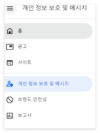 구글 에드센스로 이동해서 메뉴의 "개인 정보 보호 및 메시지" 를 클릭.