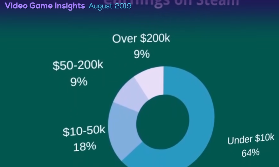 2020년 Video Game Insights의 조사에 따르면, Steam에 출시된 인디 게임의 약 50%가 4,000달러 미만의 수익을 올렸으며, 20만 달러 이상의 수익을 올린 게임은 9%에 불과했습니다.