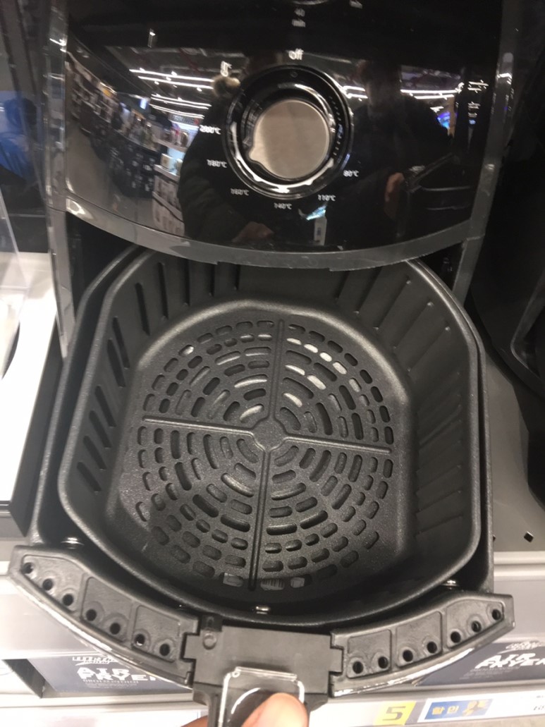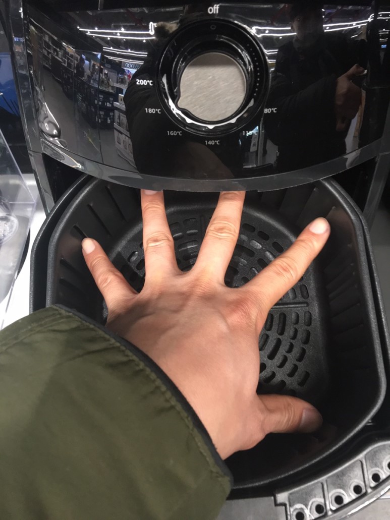 주 목적이었던 에어프라이어 용량 체크. 이게 2L 짜리 바스켓입니다. 제 손 하나 들어갈 정도의 크기네요. 2L는 확실히 작은 것 같습니다. 1~1.5인분 조리에 적합해 보이네요.