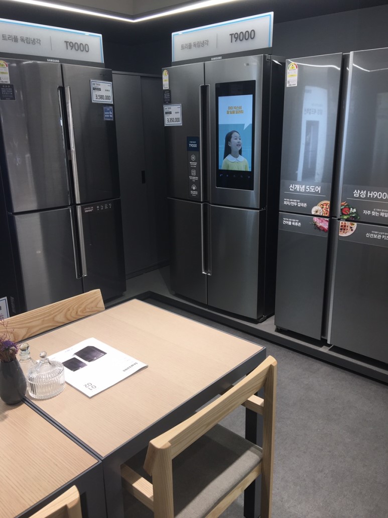 냉장고와 세탁기. 냉장고에 디스플레이가 달린 건 좀 신기. 세탁기도 점점 더 발전하는 게 보이네요.