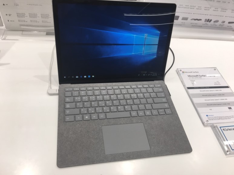 한 쪽에 놓여있던 MS 서피스. 키보드 쪽 패널 재질 촉감이 굉장히 좋았습니다. 거칠거칠한 게 중독성 있는 촉감. 서피스 자체도 터치 잘 먹고 디자인도 이쁘고. 탐나는군요.