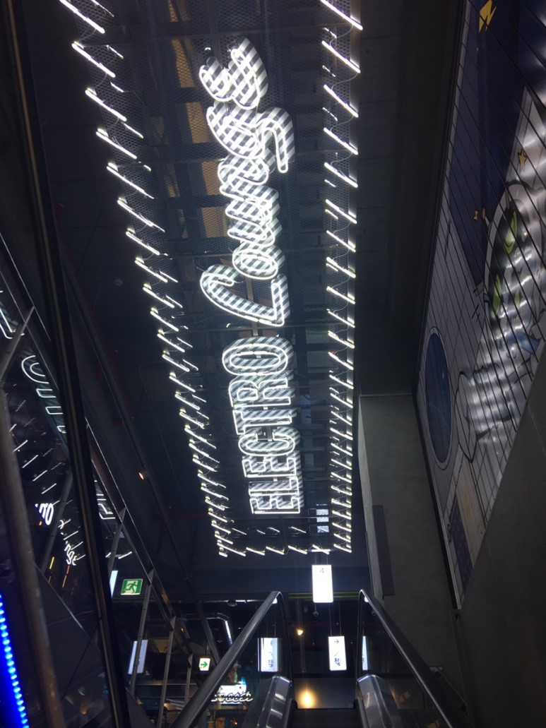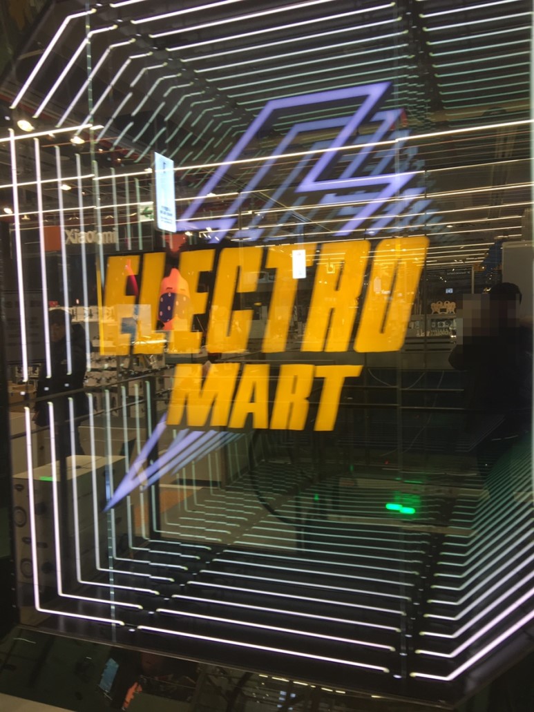1층으로 내려오는 에스컬레이터 옆에 보이는 일렉트로 마트 로고. 멋지게 만들어놨네요.