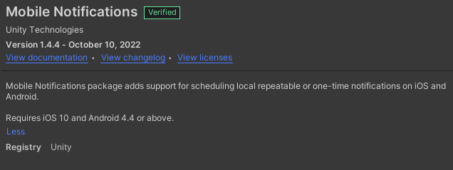 Introduction The Unity Mobile Notifications package adds support for scheduling local one-time or repeatable notifications on Android and iOS. Requirements Compatible with Unity 2019.4 or above. Compatible with Android 4.4+ (API 19) and iOS 10.0+. Supporte