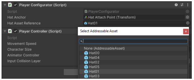 // m_Address 대신 AssetReference 인 m_HatAssetReference 를 사용.