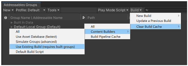 Addressables Groups 창의 Build 드롭다운 버튼을 눌러 Build Cache 를 정리할 수 있습니다.