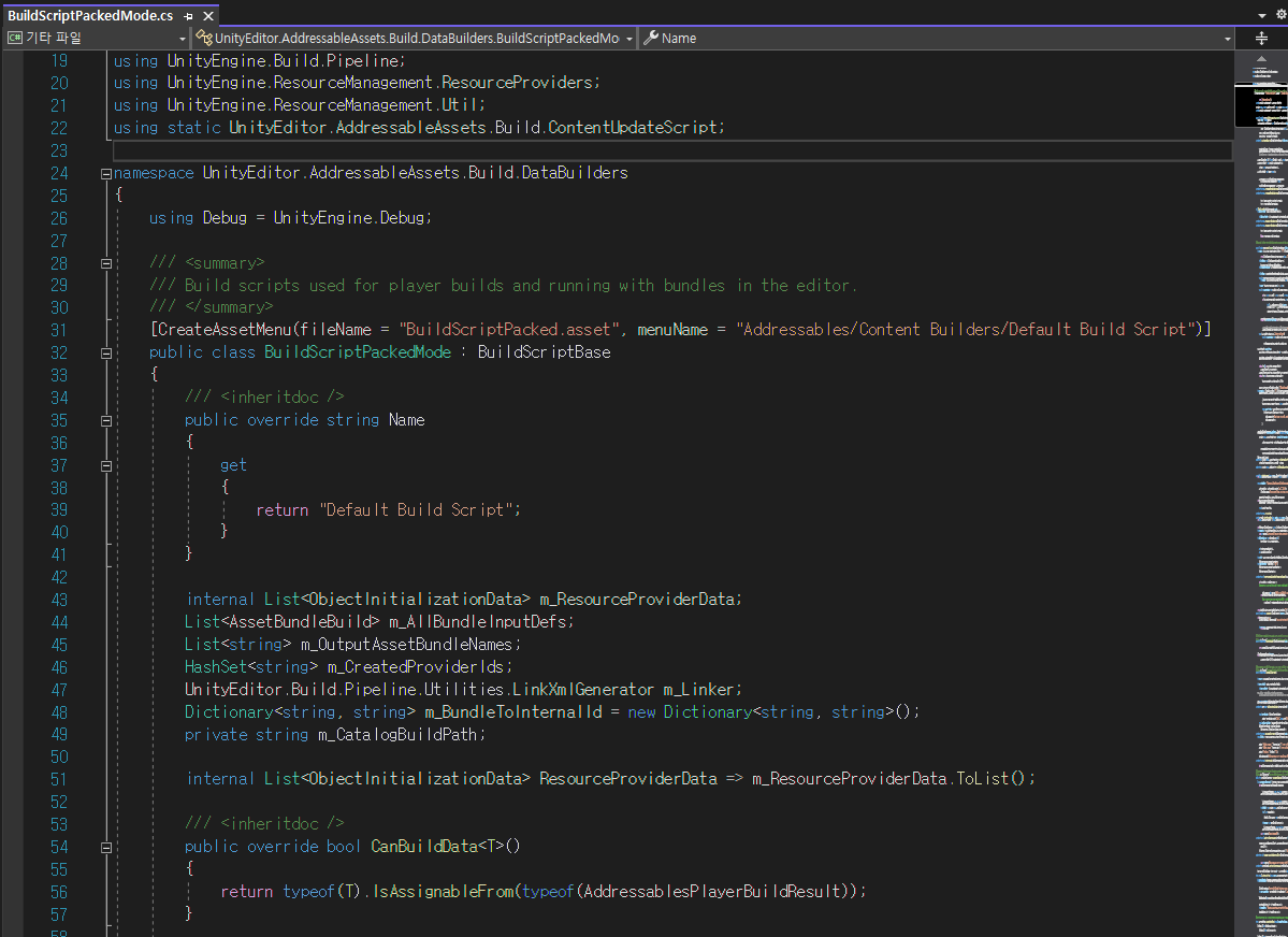 프로젝트에 "어드레서블 시스템(Addressables System)"을 처음 도입하면 "기본 빌드 스크립트(Default Build Script)"를 사용하도록 구성됩니다.