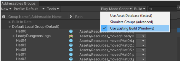 Play Mode Script 는 어드레서블 시스템의 에디터 전용 기능으로, 플레이 모드에서 시스템이 에셋을 제공하는 방식을 제어할 수 있습니다. 플레이 모드에서 허용하는 빠른 속도로 작업을 반복할 수 있습니다.