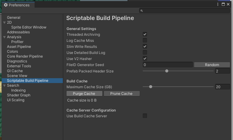 SBP 빌드 캐시를 지우려면 "Edit > Preferences > Scriptable Build Pipeline > Build Cache" 창에서 "Purge Cache" 버튼 클릭.
