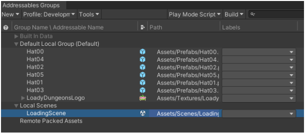 - Remote Packed Assets 그룹 이름을 Hats 로 수정하고 모자 프리팹들(Hat00~Hat05)을 이동.