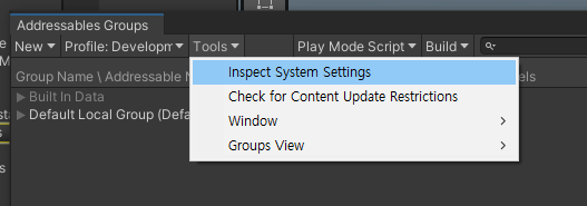 Addressables Groups 창에서 "Tools > Inspect System Settings"