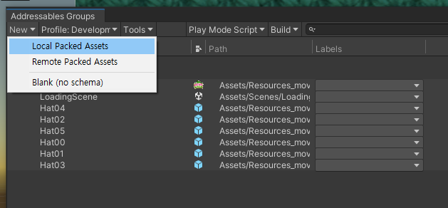 Packed Assets 템플릿을 복제해서 두 개를 생성. Local Packed Assets, Remote Packed Assets 를 생성하고 Content Packing & Loading 아래에 Paths 를 Local/Remote 로 설정.