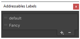 Addressables Groups 창의 우측 Labels 탭 하위 드롭다운 박스를 열고 아래 이미지와 같이 Labels 를 설정.