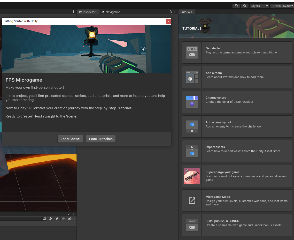 유니티 허브의 학습 코스에 있는 FPS Microgame 프로젝트를 돌려봤습니다. 유니티로 제작된 샘플 게임 프로젝트를 바탕으로 튜토리얼이 쉽고 상세하게 잘 돼있는 구성.