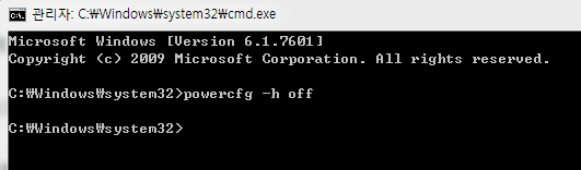 Command Line 을 관리자모드로 실행한 뒤에 powercfg -h off 명령어와 인자를 입력해주면 끝.