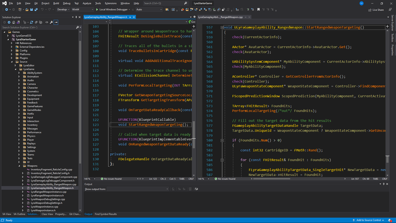 샘플 프로젝트와 같은 네트워크 기반 1인칭 슈팅 게임의 중요한 특징은 플레이어 입력에 대한 빠른 반응 속도. C++로 작성된 무거운 네트워크 게임플레이 코드를 볼 수 있는 이유도 바로 이 때문.