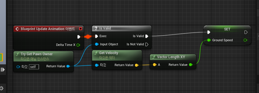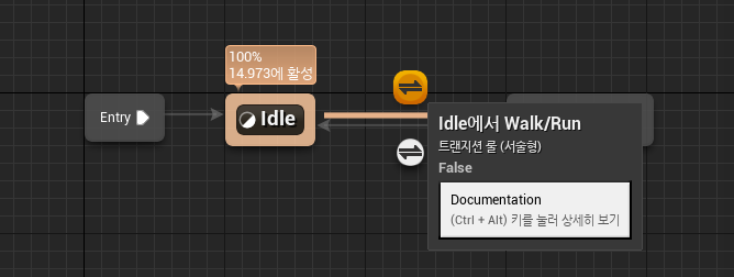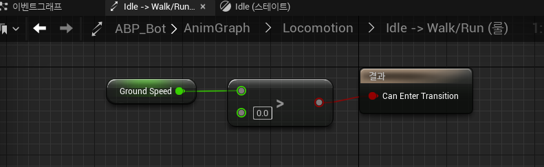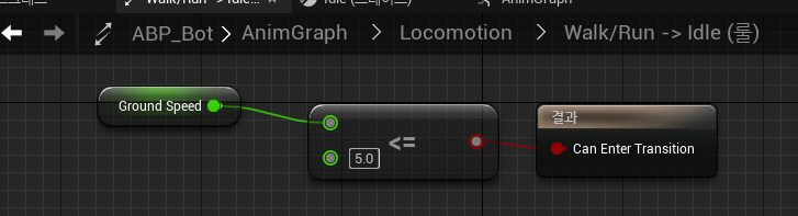 룰을 만들기 전에 GroundSpeed 라는 변수를 만들어서 Velocity 를 가져와 저장하도록. 그리고 트랜지션 룰에서는 GroundSpeed 변수가 0보다 크면 Can Enter Transition 값에서 True 를 리턴하도록. 반대로 Walk/Run 에서 Idle 로의 트랜지션 룰에는 5 보다 작거나 같으면 True 가 되도록 작성.