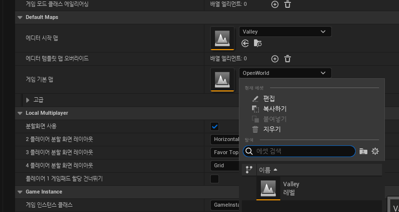 기본 레벨과 맵도 여기서 설정하는데, 제작중인 Valley 로 수정.