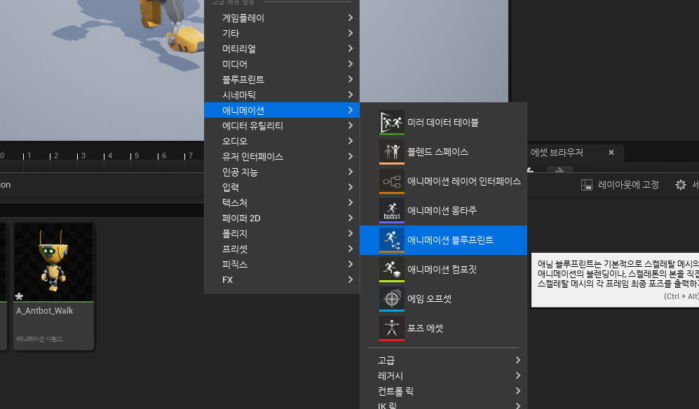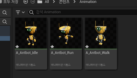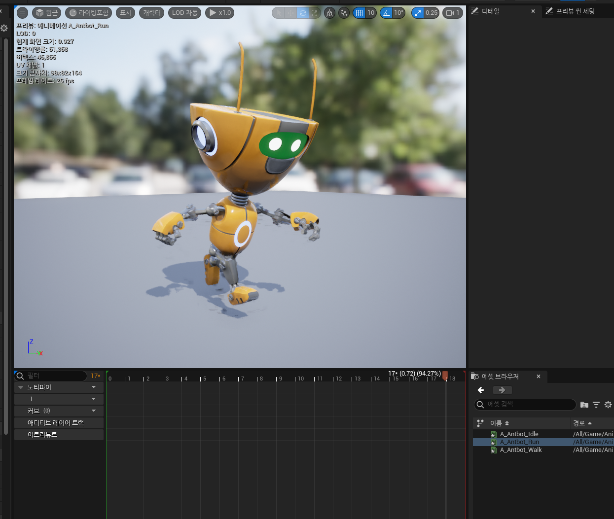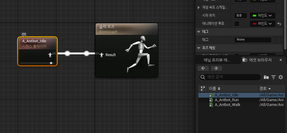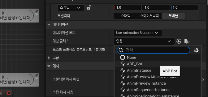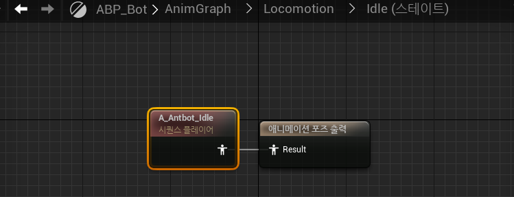 이렇게 생성한 애니메이션 블루프린트를 캐릭터 블루프린트에 연결 해줘야 함. BP_Bot 을 열어서 디테일뷰의 애니메이션/애님 클래스 속성을 방금 만든 애니메이션 블루프린트로 설정해줘야 함. 지금은 Idle 애니메이션 리소스만 연결했기 때문에 부자연스럽. 애니메이션 블루프린트에 상태에 따른 애니메이션 로직을 설정해야 함.
