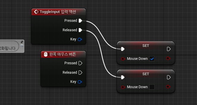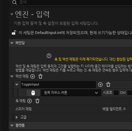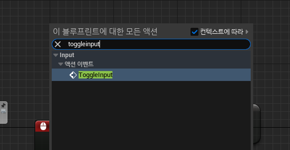 엔진 -입력 프로젝트 셋팅에서 바인딩을 설정하면 블루프린트에서 Action Events 를 핸들링 할 수 있어짐. 아래처럼 ToggleInput 이라는 이름으로 마우스 왼쪽 버튼을 추가하고 블루프린트에서 노드를 생성해 처리할 수 있음.