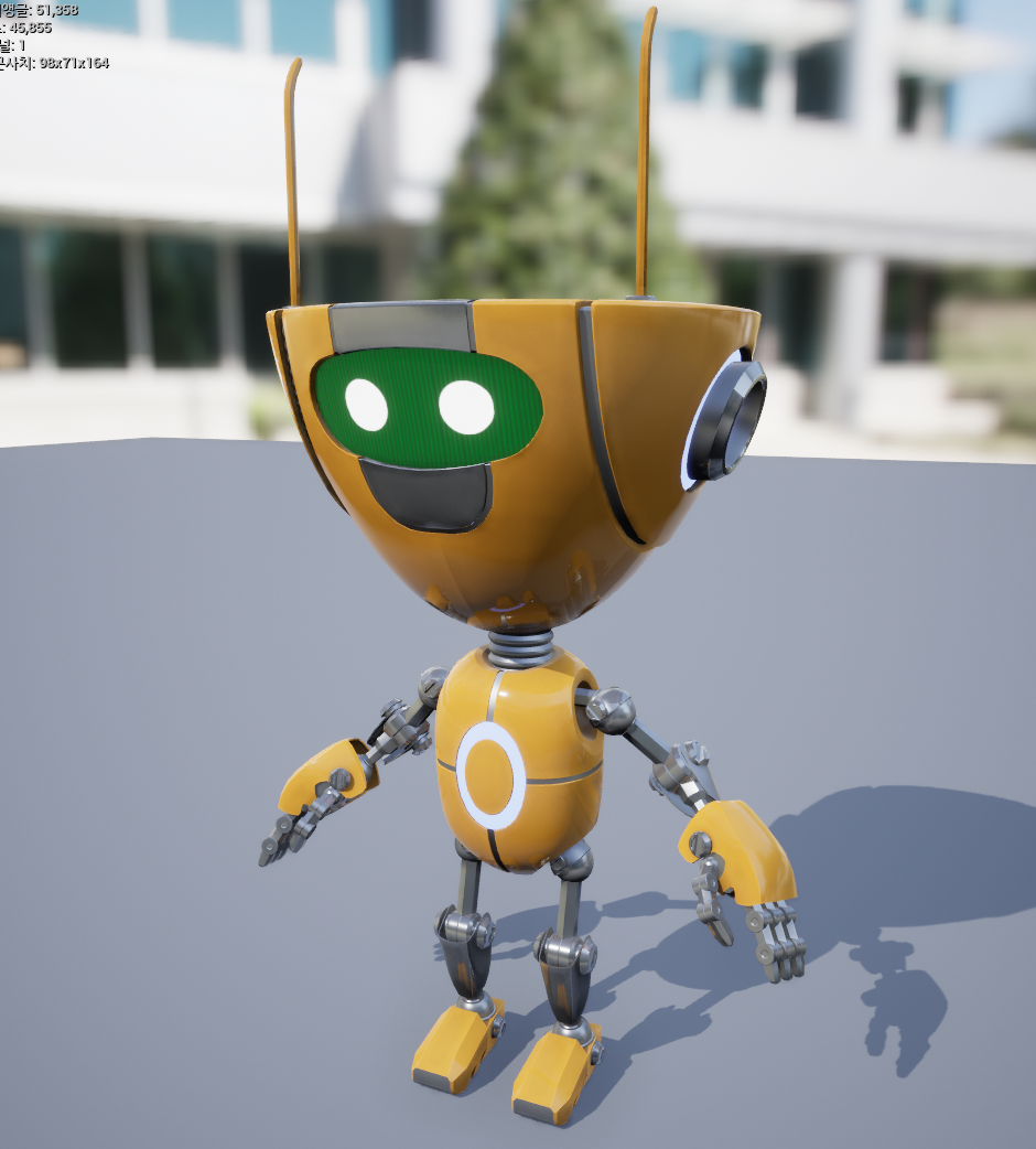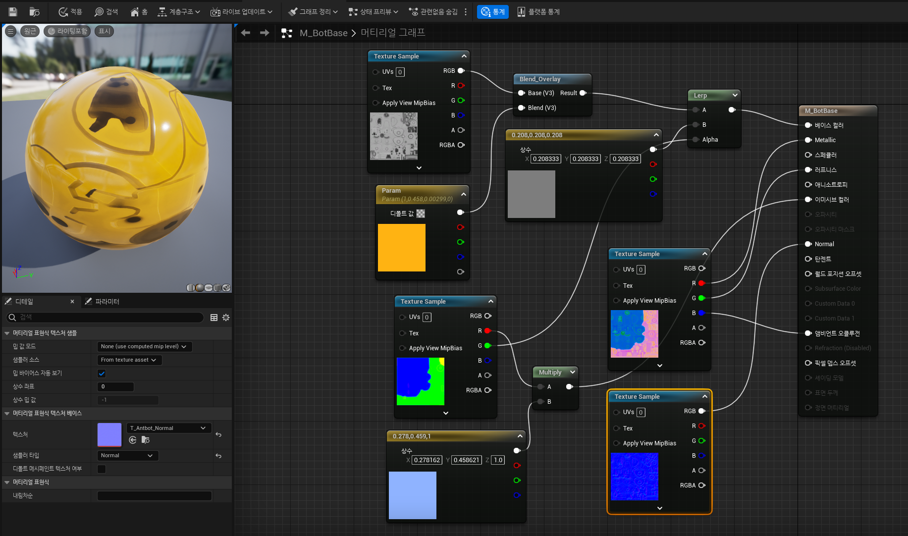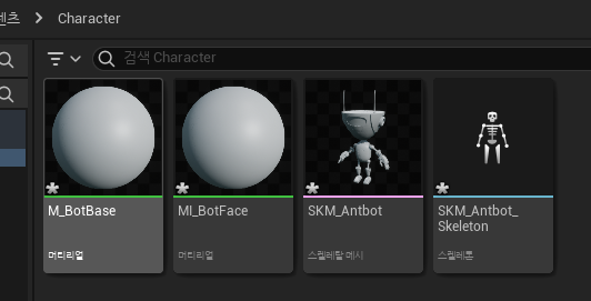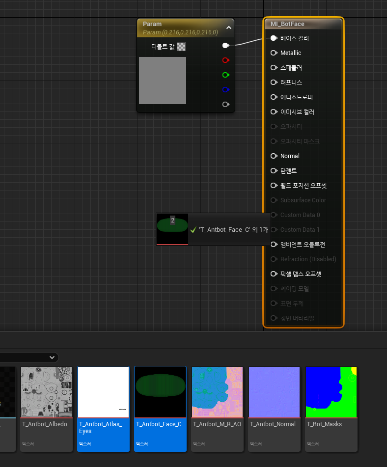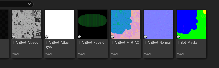 이어서 캐릭터에 입힐 머티리얼을 생성. 텍스쳐들을 임포트 해야함. 알베도, 눈 얼굴, 노멀, 마스크 등... T_Andbot_M_R_AO 텍스쳐는 각 RGB채널마다 Metalness, Roughness, AO 정보를 나눠 담고 있습니다. BotBase 머티리얼과 BotFace 머티리얼 둘 다 작업 해줘야.