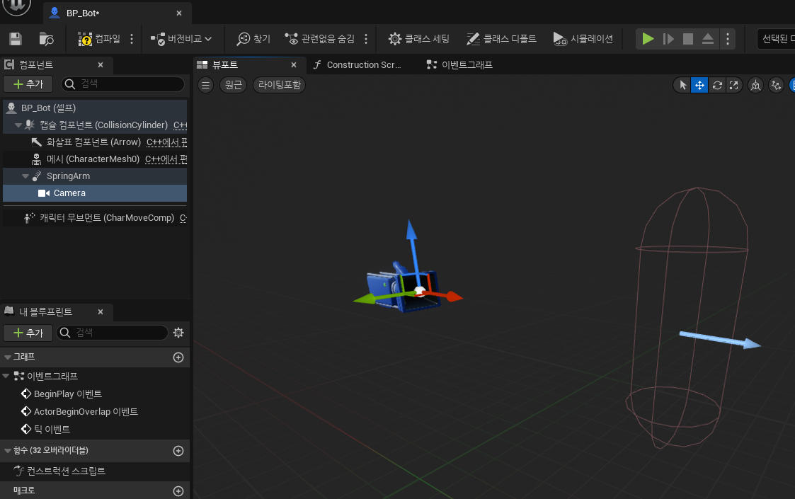 카메라는 봇에 붙여보는 것으로. Spring Arm 컴포넌트를 추가해서 셀카봉 개념으로 카메라까지 생성해서 어테치해준다. Spring Arm 을 -60 정도 올려주고, 거리는 2000. FOV 도 45도 정도로 설정.