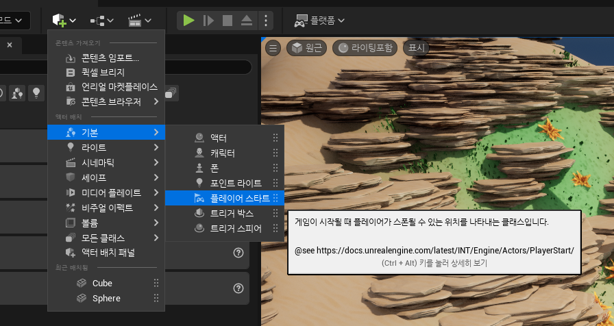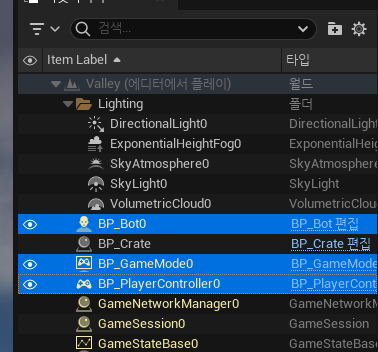 액터 생성 메뉴에서 [기본>플레이어 스타트] 액터를 사용하면 됨. 스타트 액터는 End 키를 입력해서 땅에 붙여주면 좋음. 모두 설정한 뒤에 플레이 모드를 시작하면 아웃라이너에 직접 제작한 블루프린트들이 생성돼있는 걸 볼 수 있음.