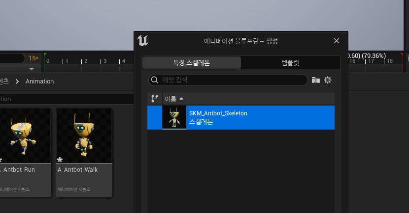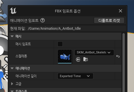 애니메이션 리소스 임포트. 메시는 필요없으니 체크 해제. 스켈레톤은 앞에서 만든 Bot 을 설정. 임포트를 마치면 애니메이션 리소스가 임포트 완료.